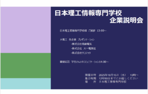 本日は、社長が講師を務める日本理工情報専門学校の企業説明会に参加しました。